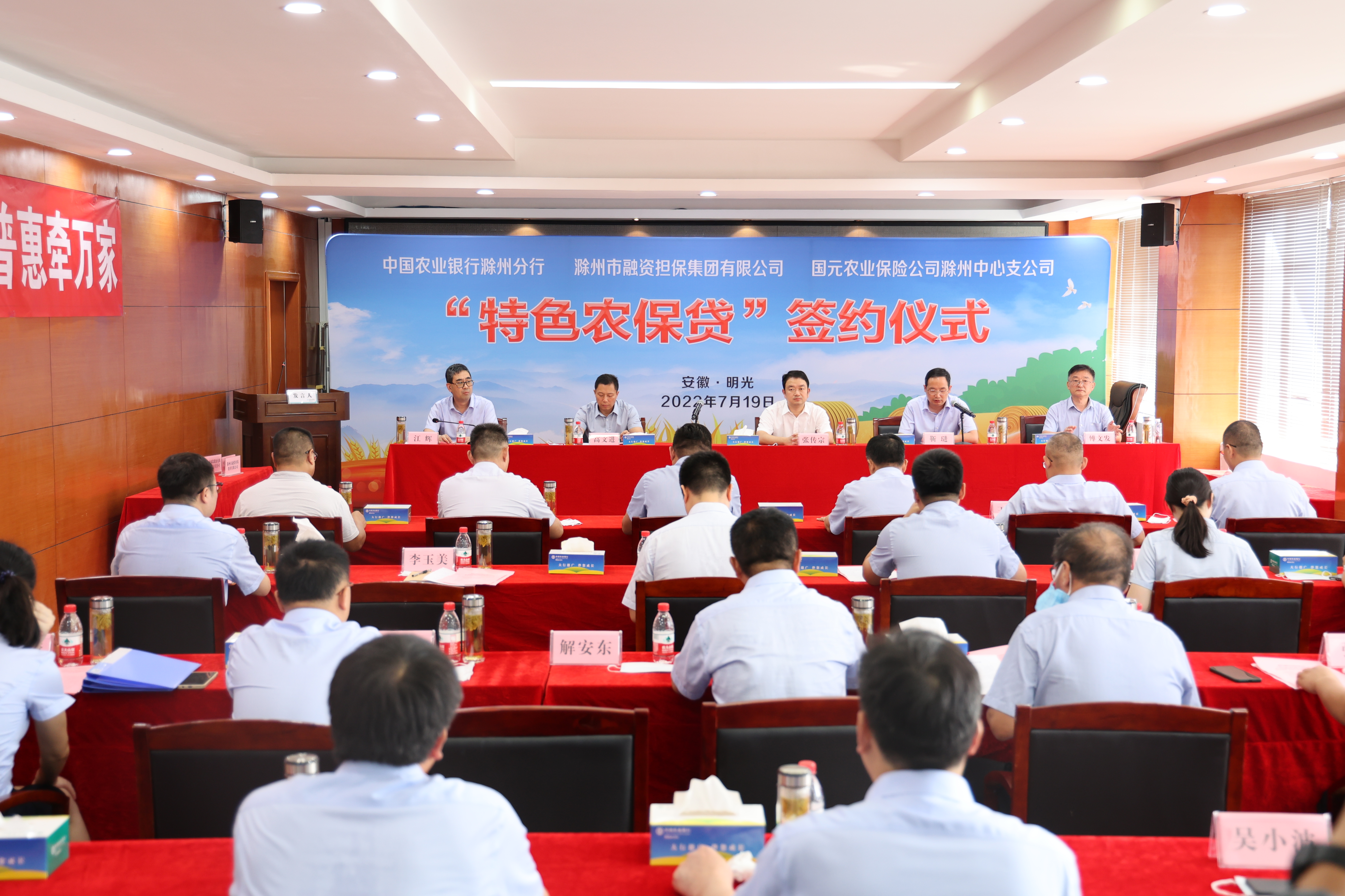 為進(jìn)一步更好地服務(wù)“三農(nóng)”,助力滁州鄉(xiāng)村振興,7月19日,市擔(dān)保集團(tuán)、農(nóng)行滁州分行及國元農(nóng)保滁州中支在明光市共同舉辦“特色農(nóng)保貸”簽約儀式。明光市委副書記、市長張傳宗,滁州市擔(dān)保集團(tuán)黨委書記、董事長、總經(jīng)理高文進(jìn),農(nóng)行滁州分行黨委書記、行長靳琎,國元農(nóng)保滁州中支黨支部書記傅文發(fā)等有關(guān)領(lǐng)導(dǎo)及部分農(nóng)戶代表出席簽約儀式。